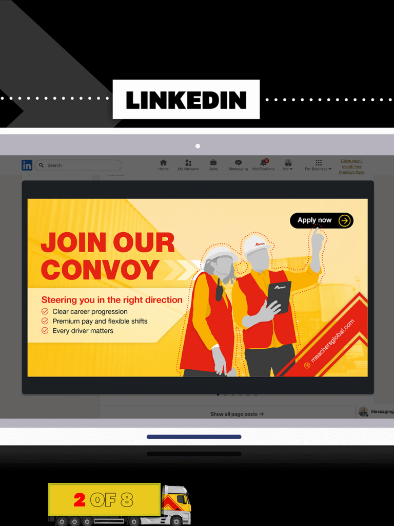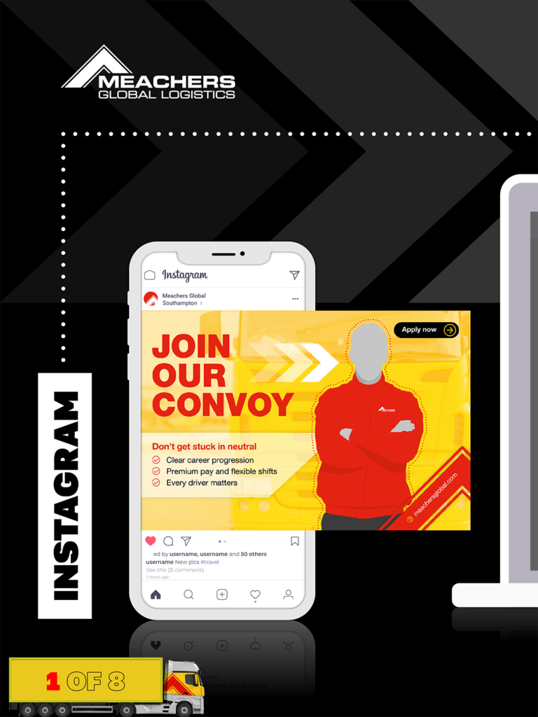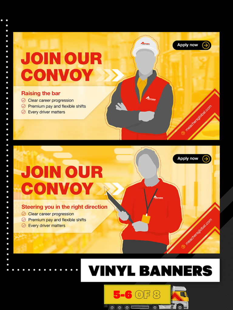 This multi-channel social media campaign was designed to attract and engage potential drivers, office and warehousing staff by presenting a bold, consistent, and people-led message across Instagram, LinkedIn, Facebook, and large-format vinyl banners. Built around the central call to action “Join Our Convoy”, the campaign positions the business as supportive, progressive, and driver-focused.