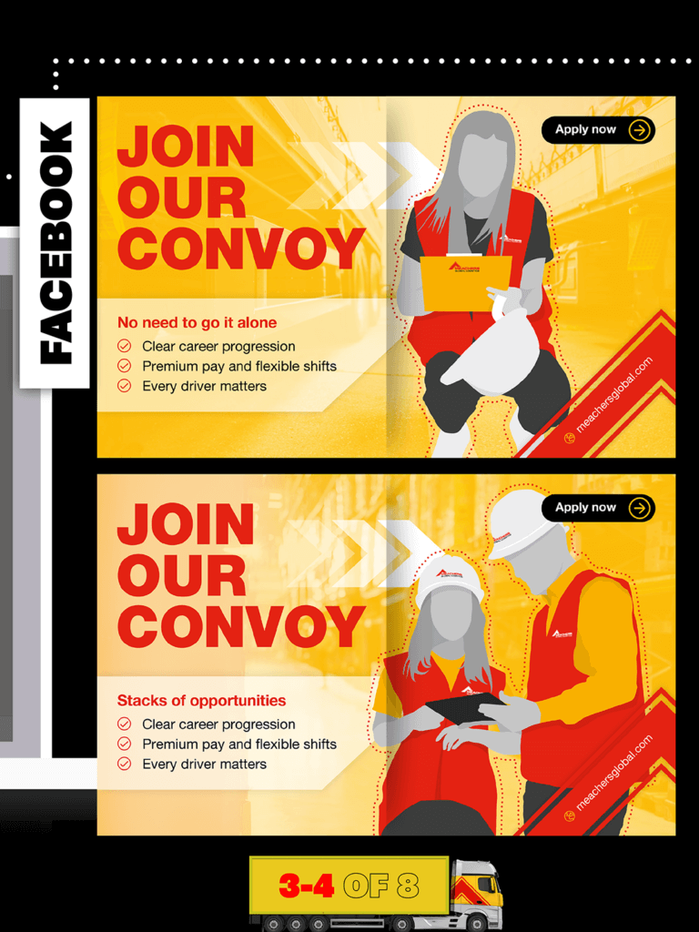 A flexible visual system was created to allow multiple creative variations while maintaining strong brand recognition. Each execution highlights key benefits such as career progression, flexible shifts, and the value placed on every driver, ensuring relevance across different audiences and platforms. The use of high-impact colour, directional graphics, and confident typography reinforces momentum and forward movement, echoing the convoy theme.